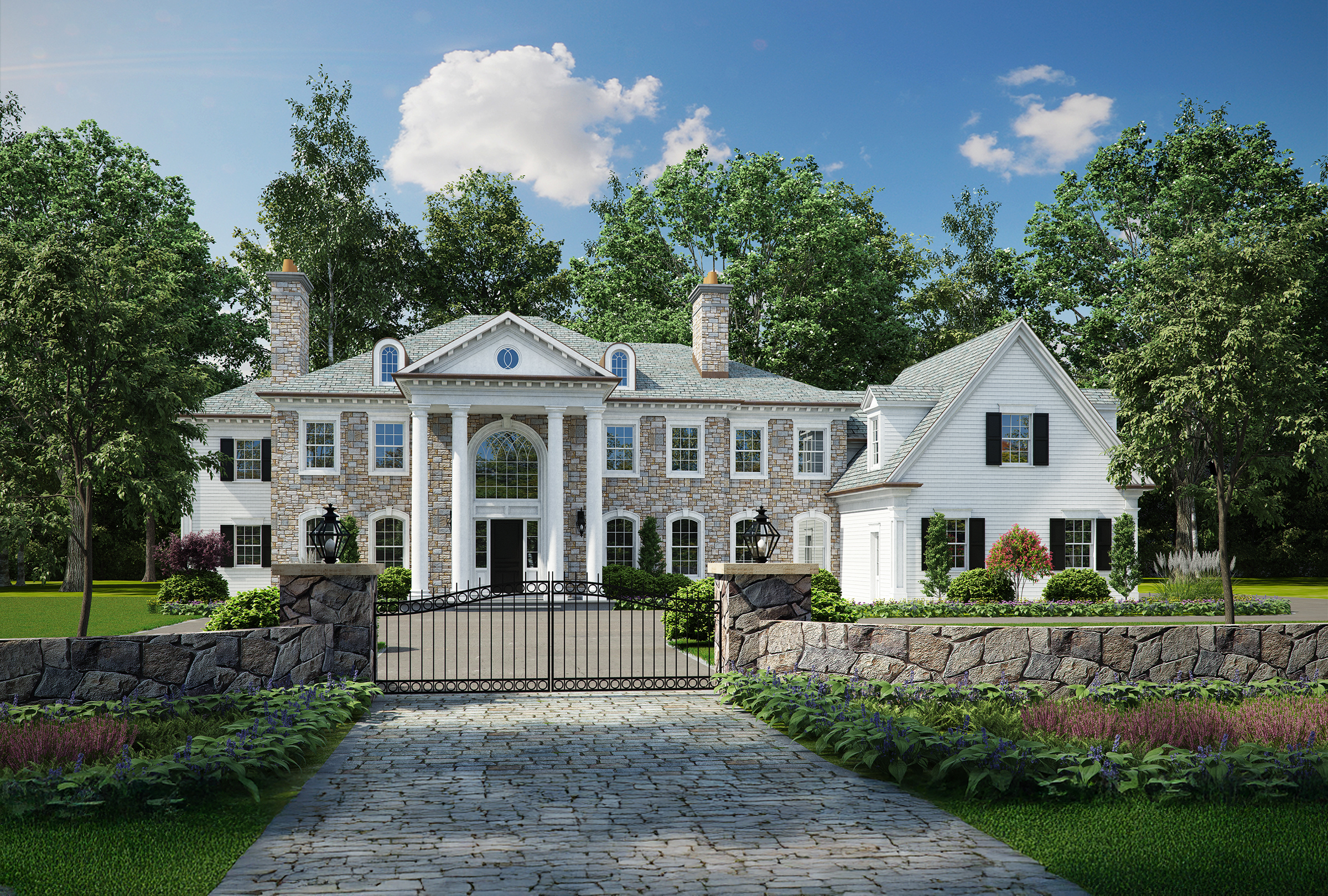 Grand stone colonial in Greenwich, CT featuring a blend of natural full bed stone and cedar siding with Vermont grey natural slate roof. Set on a private 2.5 acre parcel, this 11,000 sf estate features a heated pool, pool house, outdoor dining area with retractable pergola with flush heatlamps, BBQ station and large bluestone patio. Constructed with superior quality, craftsmanship by award wining builder, KOSL Building. The traditional layout features intricate millwork, 3-story elevator, 3-car heated garage and 3 stair cases with 7 bedrooms and 8-1/2 bathrooms in addition to a 3,200 sf finished basement showcasing a gym, rec room, sauna, office, bedroom and lounge.