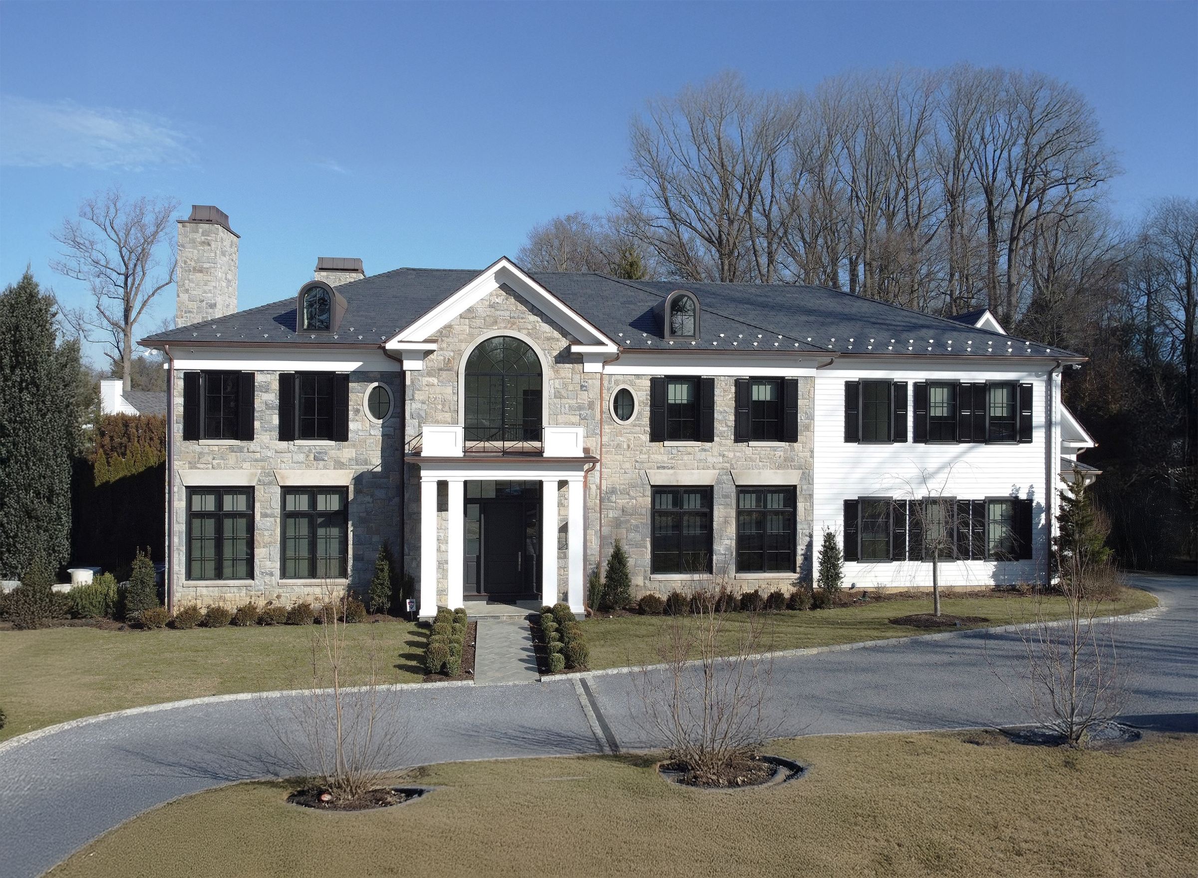 Creative Scarsdale Colonial with Spanish black slate roof and full bed liberty hill granite stone complimented by cedar plank siding. Set on secluded and flat 0.6 acre lot in Scarsdale, this 7,000 sf home was gracefully built by award winning Luxury builder, KOSL Building. Constructed with superior quality, craftsmanship, modern millwork, 10′ Ceilings on 1st fl, brick & stone & thoughtful transitional layout. The 1st fl boasts a chef’s kitchen with a flowing butler’s pantry, opening to family room & easy access to mudroom/3-car garage. A sweeping double story secluded staircase to 2nd fl w/ 9′ ceilings boasts a family room, fireplace, luminous French door to back patio with tranquil views. A separate vestibule leads into master suite with custom millwork and home office. Four additional bedrooms all with private bathrooms leading to laundry & back staircase. Enjoy seamless outdoor entertaining experience with cedar pergola, outdoor fireplace surrounded by extensive screening and plantings. Appx 2,800 SF finished basement with 2 staircases, bedroom/bath, movie theatre, wine cellar, entertainment bar, full gym and recreation room.